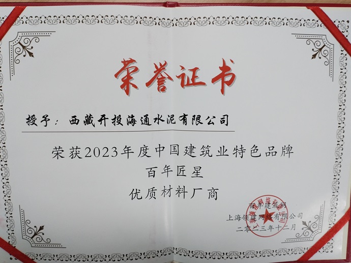 西藏開投海通水泥公司榮獲中國(guó)建筑業(yè)特色品牌百年匠星優(yōu)質(zhì)材料廠商榮譽(yù)稱號(hào)