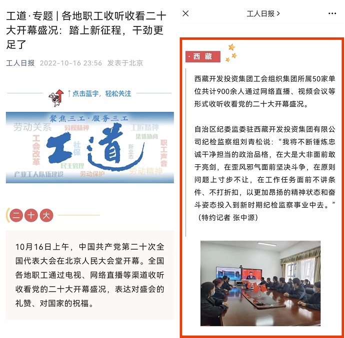 《工人日?qǐng)?bào)》節(jié)選刊發(fā)集團(tuán)公司干部職工收聽收看黨的二十大開幕盛況新聞信息