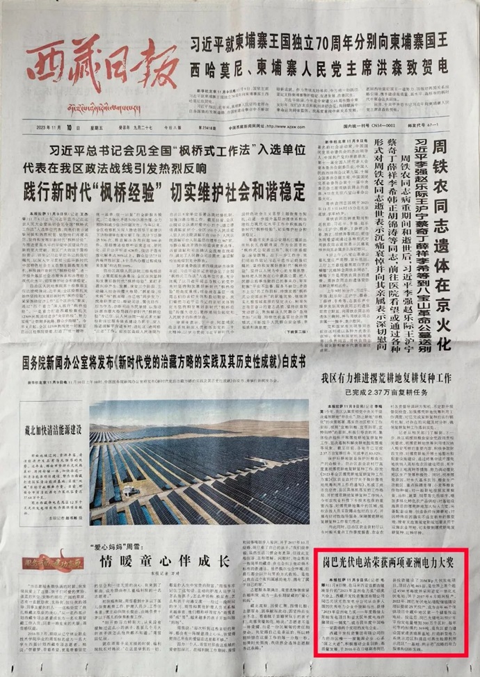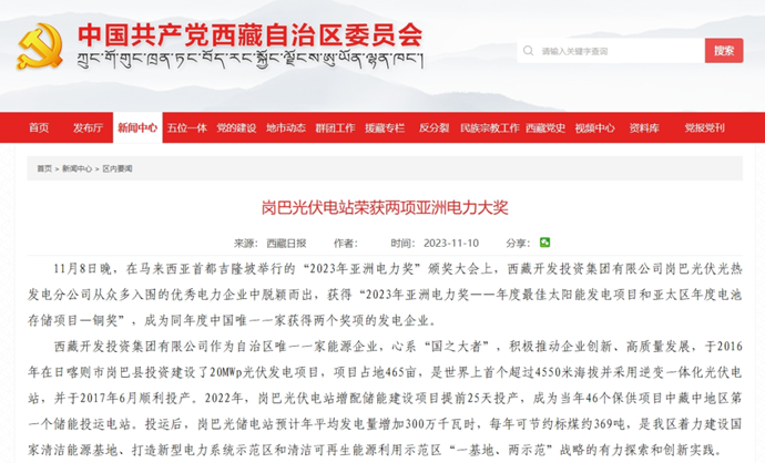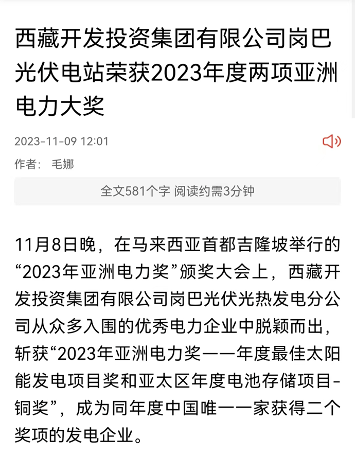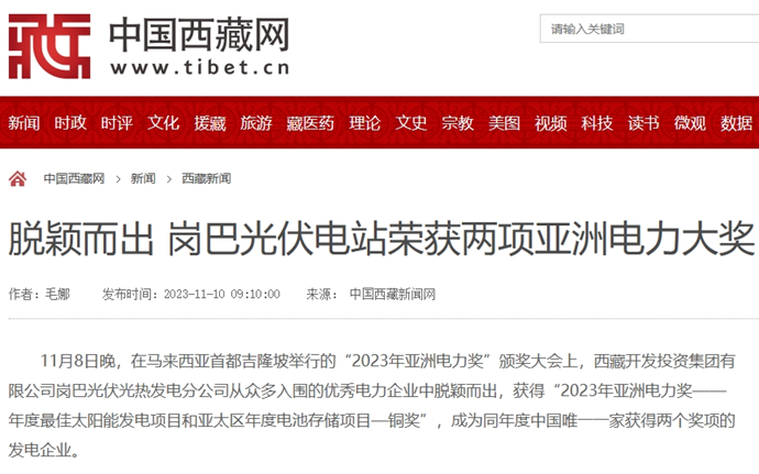 科技日?qǐng)?bào)、西藏日?qǐng)?bào)、西藏日?qǐng)?bào)客戶端等多個(gè)媒體報(bào)道了《西藏開發(fā)投資集團(tuán)有限公司崗巴光伏電站榮獲2023年度兩項(xiàng)亞洲電力大獎(jiǎng)》