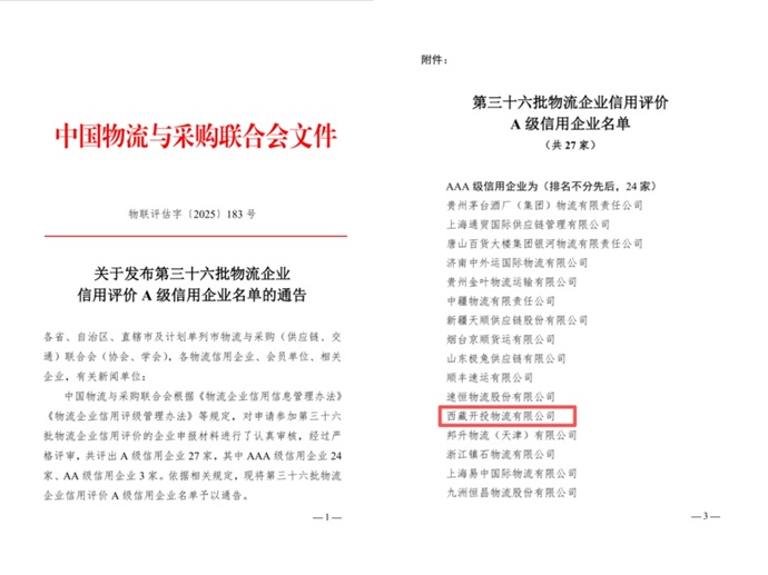 喜報丨物流公司獲評中物聯(lián)AAA級信用企業(yè)