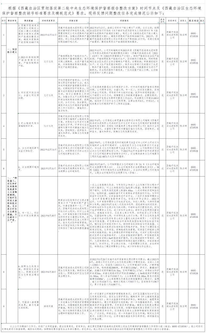 西藏開投海通水泥有限公司關(guān)于第二輪中央生態(tài)環(huán)境保護(hù)督察反饋問題整改落實(shí)情況的公示