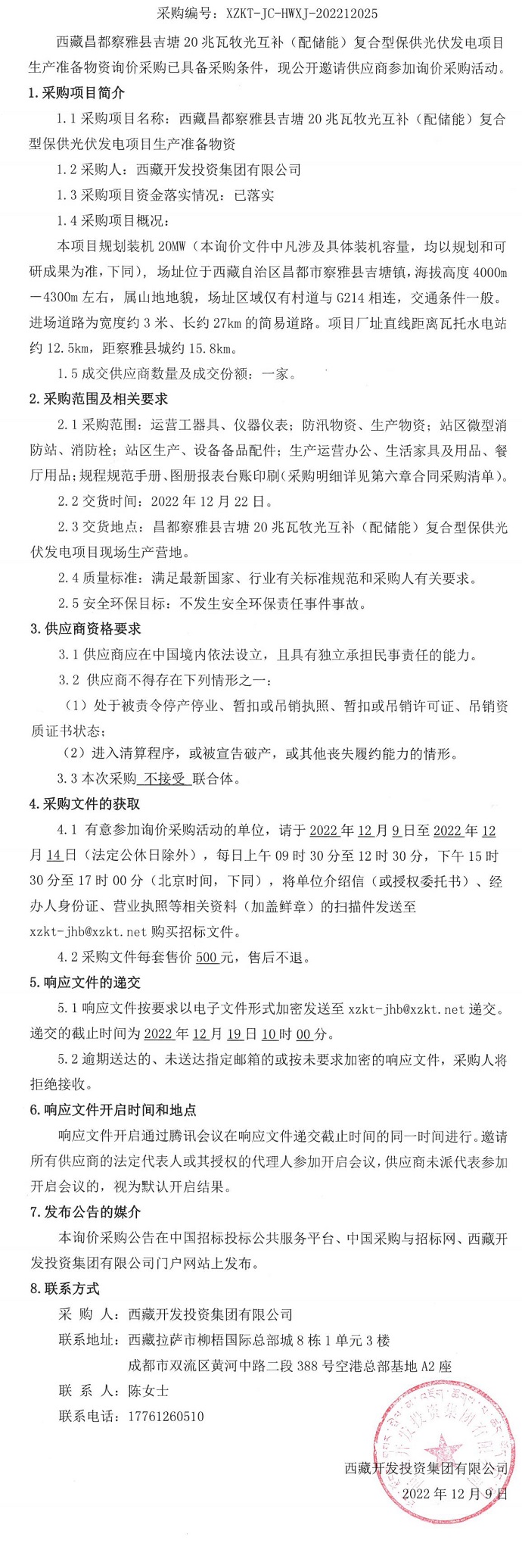 光伏發(fā)電項目生產(chǎn)準備物資詢價采購公告