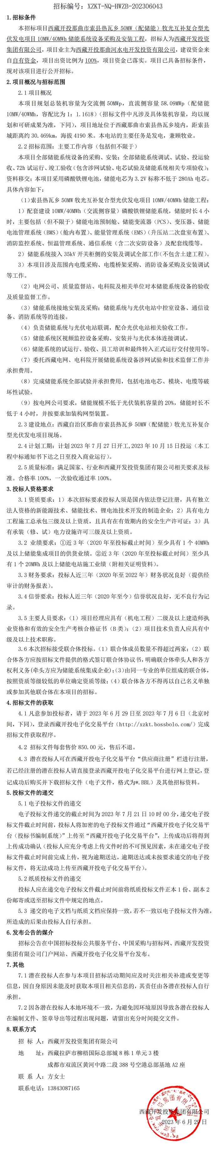 西藏開投那曲市索縣熱瓦鄉(xiāng)50MW(配儲能)牧光互補復(fù)合型光伏發(fā)電項目10MW/40MWh儲能系統(tǒng)設(shè)備采購及安裝工程招標公告
