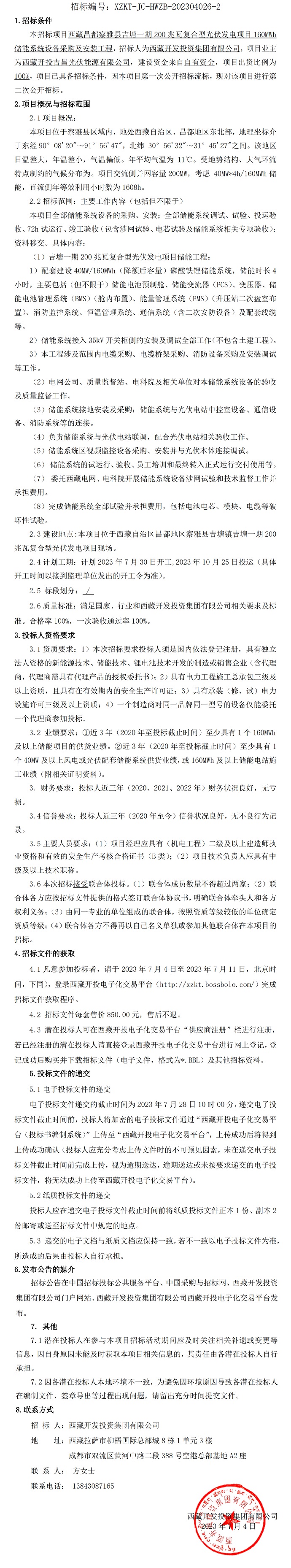 西藏昌都察雅縣吉塘一期200兆瓦復(fù)合型光伏發(fā)電項(xiàng)目160MWh儲能系統(tǒng)設(shè)備采購及安裝工程招標(biāo)公告(第二次)