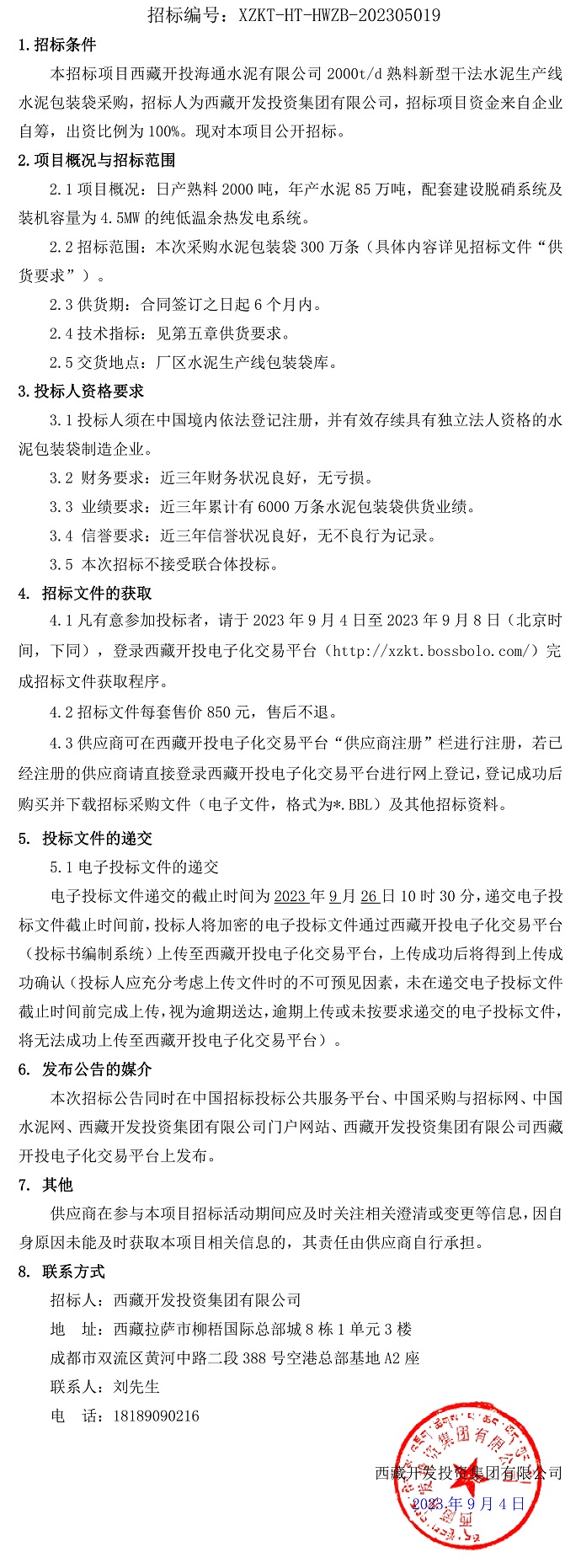 西藏開投海通水泥有限公司2000t/d熟料新型干法水泥生產(chǎn)線水泥包裝袋采購招標(biāo)公告