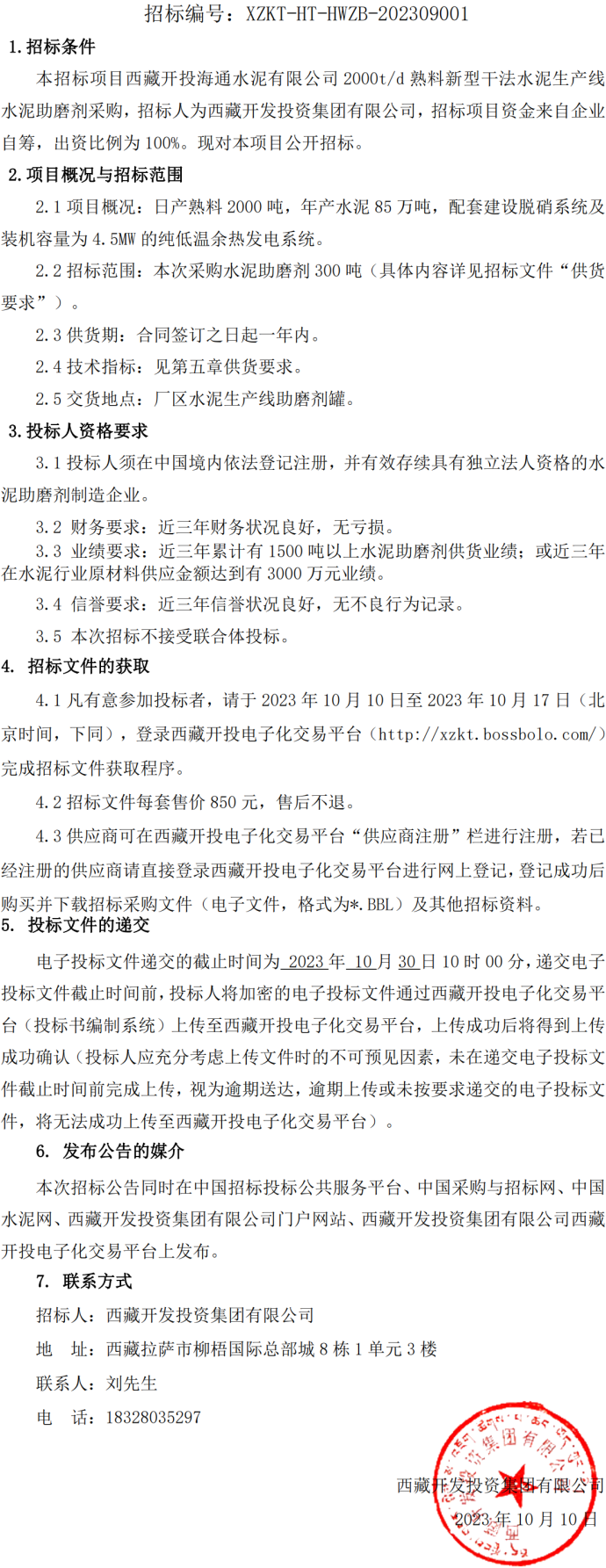 西藏開投海通水泥有限公司 2000t/d 熟料新型干法水泥生產(chǎn)線水泥助磨劑采購招標(biāo)公告