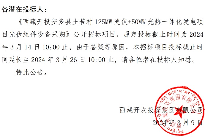 一體化發(fā)電項目光伏組件設(shè)備采購》投標(biāo)截止時間的公告