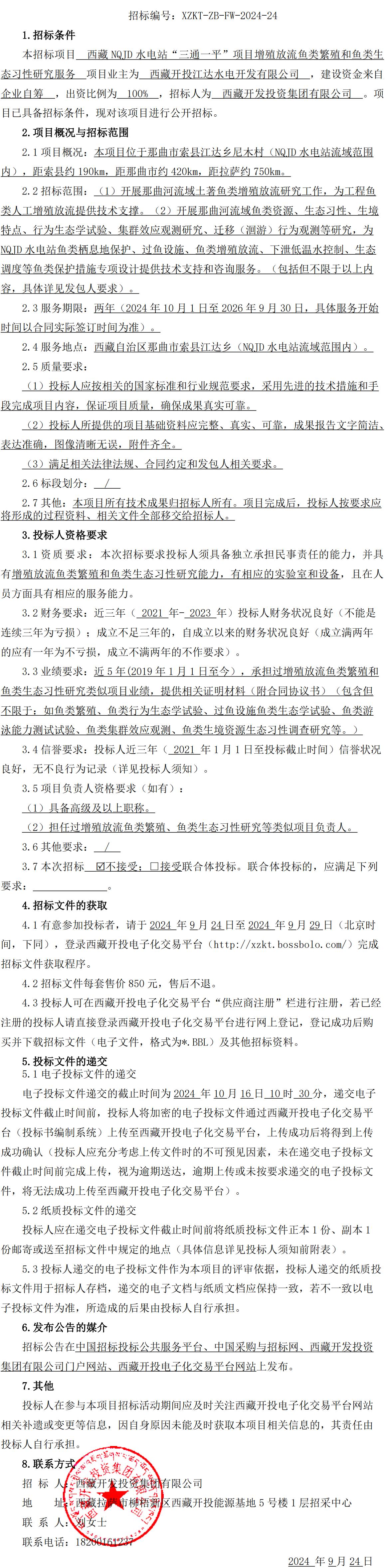 西藏 NQJD 水電站“三通一平”項目增殖放流魚類繁殖和魚類生態(tài)習性研究服務招標公告