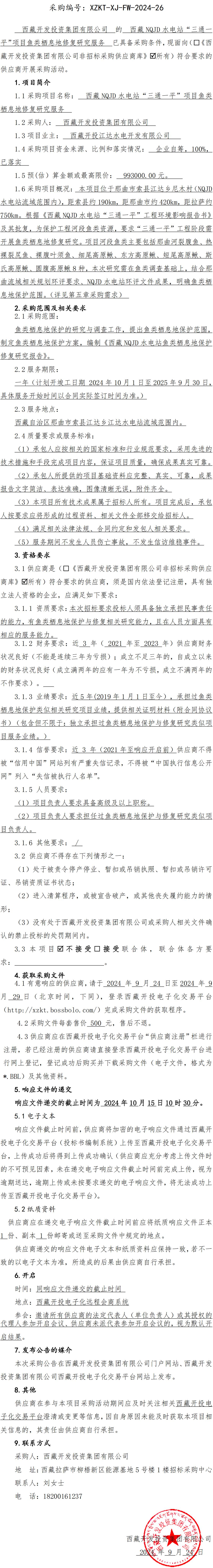 西藏NQJD水電站“三通一平”項(xiàng)目魚類棲息地修復(fù)研究服務(wù)詢價(jià)采購(gòu)公告