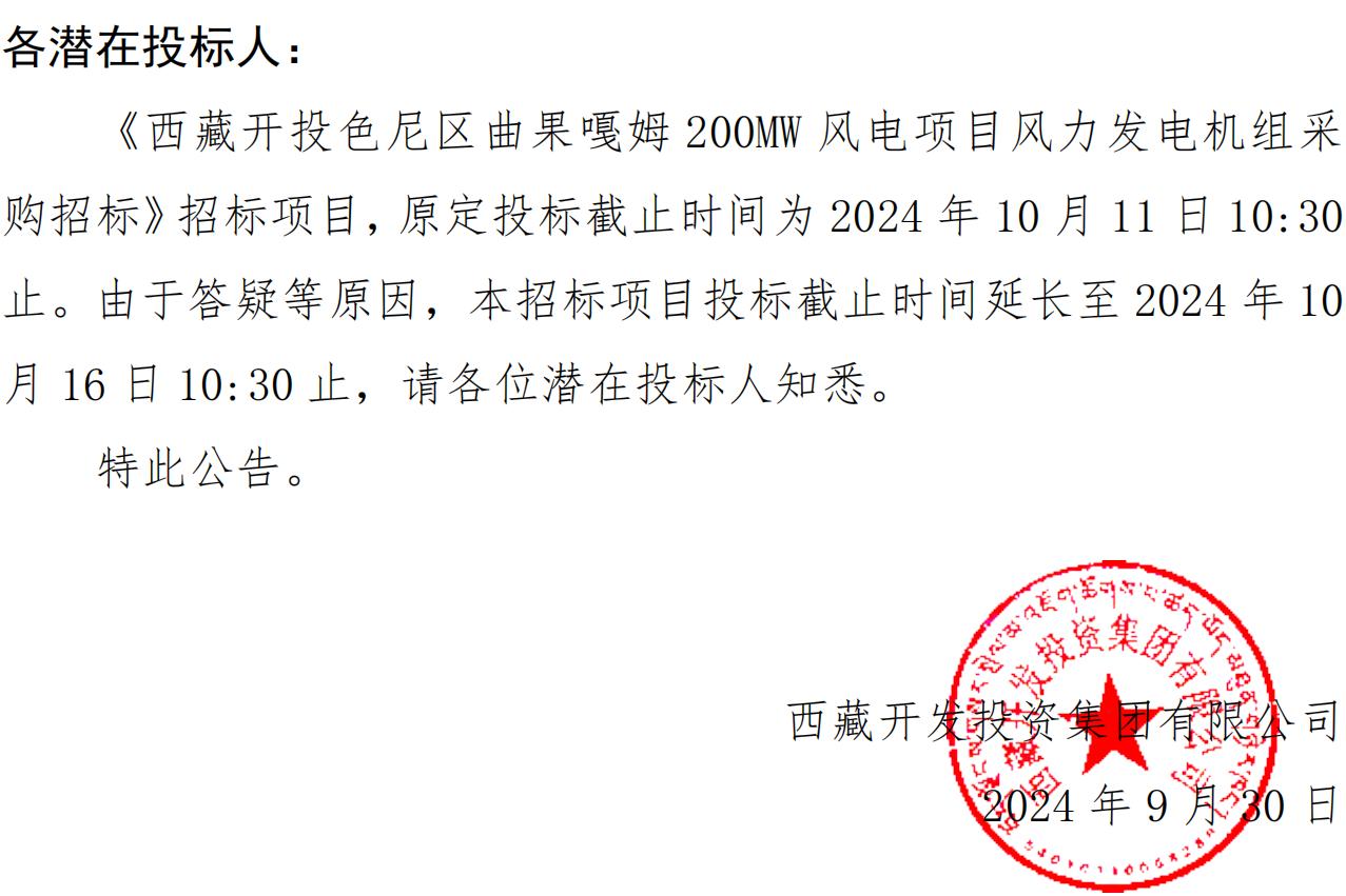關(guān)于延長(zhǎng)《西藏開投色尼區(qū)曲果嘎姆200MW風(fēng)電項(xiàng)目風(fēng)力發(fā)電機(jī)組采購(gòu)招標(biāo)》投標(biāo)截止時(shí)間的公告