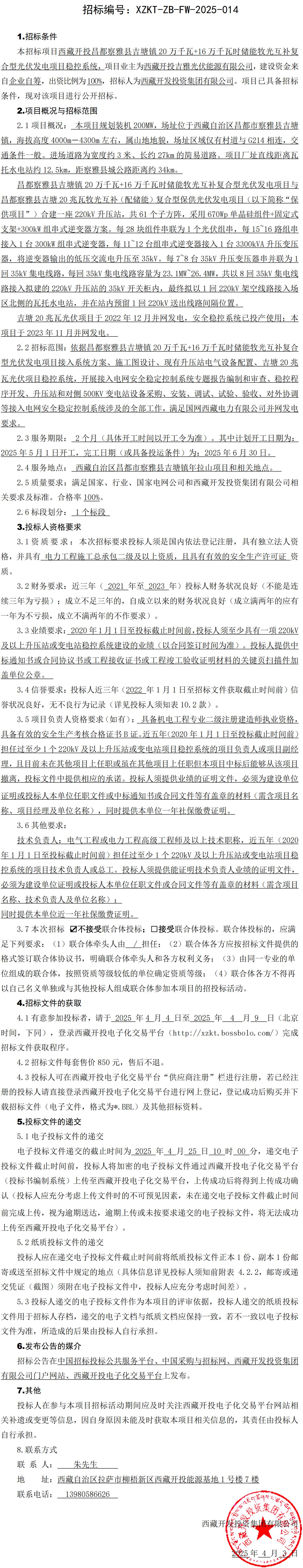 西藏開投昌都察雅縣吉塘鎮(zhèn)20萬千瓦+16萬千瓦時儲能牧光互補復合型光伏發(fā)電項目穩(wěn)控系統(tǒng)招標公告